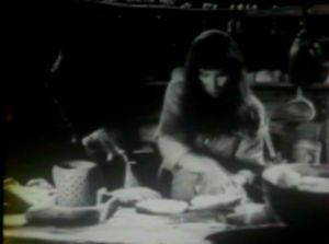 Elle coupe un pain en deux (plan 33). Elle gratte nerveusement la mie d'une moitié du pain. Elle mange la mie et gratte l'autre moitié. Elle mange à nouveau de la mie et jette le reste. Puis, elle prend un crapaud dans un pot, le met dans une moitié du pain et le recouvre (plan 35). (Cf. Photogramme – Présage 1.)