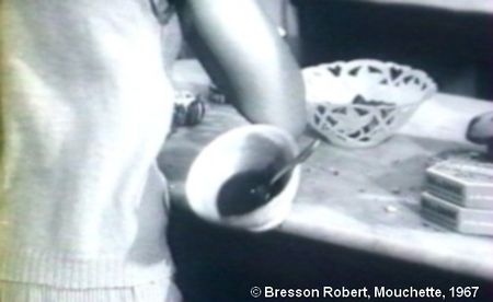 A un moment, Mouchette se retourne, et renverse le bol de café au sol.