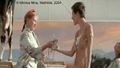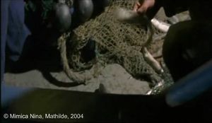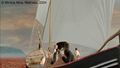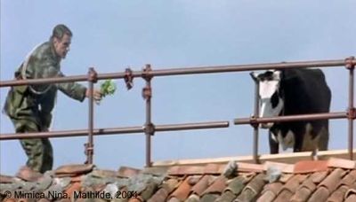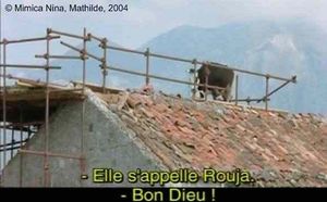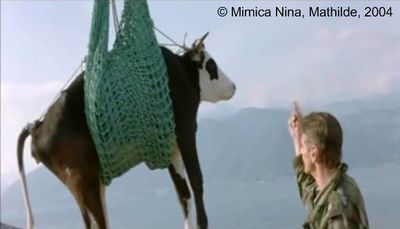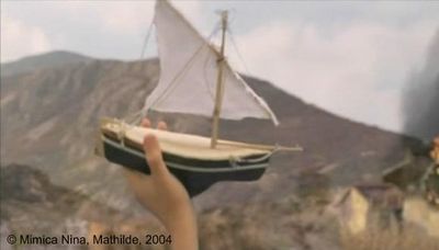 Photogramme 78 : Séquence 146 [Postlogue 3] - Plan 1860 : 1h 35' 15": Sur un bateau avec une voile blanche immaculée, le Docteur porte Misho, derrière eux, nous retrouvons Mathilde, heureuse et joyeuse, en train de danser, elle passe à côté de sa mère, qui donne à manger des marguerites à Rouja, la vache, puis Mathilde se dirige vers son amie de l’auberge, elle l’enlace, son amie lui indique avec le doigt quelque chose vers le haut du bateau (une voile à fixer ?), ensuite, c’est au tour de Rita, la propriétaire de l’auberge, qui lui donne une corde. Mathilde tire avec la corde.