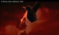 Photogramme 74 : Séquence 136 [Aa2 - 10] - Plan 1763 : 1h 31' 37": La situation bascule. Misho sort de la cabane en criant « Papa ! » On tire sur De Petris. Le corbeau-dragon apparaît dans un ciel rougeoyant. De Petris s’affale au bord de la plage. Mathilde sort à son tour en criant.