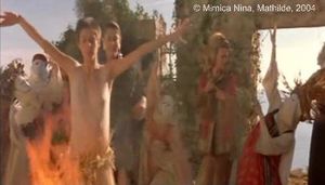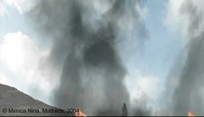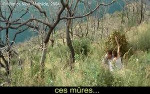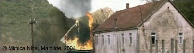 Tel est le cas du film Mathilde, l’ouverture du film est bouleversant, les plans se précipitent et s’enchaînent à un rythme terrible, pour ne pas dire infernal. Chaque plan nous livre une direction particulière, parfois une direction polyvalente. Il en est ainsi, du premier plan du film, le bateau en feu qui conduira d’une part, vers d’autres images de bateau qui auront un rôle important dans le film, puisque le dernier plan du film est un bateau avec une voile blanche immaculée, et d’autre part vers le feu qu’on retrouvera souvent au cœur du film, comme par exemple, les séquences du « corbeau-dragon » qui sont très sensibles, liaison du feu avec un oiseau, qui a son tour est en relation avec les mouettes, oiseau messager. Les séquences du « corbeau-dragon » démontrent avec un détour hautement poétique la transformation ou le passage de l’enfant Misho dans la dure réalité de la guerre, rappelons que la séquence est précédée par un bateau en jouet que l’enfant s’amuse à faire naviguer dans le ciel. Nous retrouvons également le feu au plan 6, avec le balai en feu, sur lequel un enfant s’amuse à jouer au sorcière. Mais de nouveau, nous retrouvons le balai plus loin dans le film, quand De Petris raconte à mathilde que sa nourrice lui racontait des histoires effrayantes, Mathilde lui demande alors : Elle volait sur un balai aussi ? Mais ce n’est pas tout, aussitôt après le plan 6, nous retrouvons une balançoire, subitement abandonnée, qui oscille, afin, peut-être, d’éventée ces feux ardents qui consume le pays. Et de nouveau, nous retrouverons une première balançoire dans le bordel, et une seconde avec l’histoire du chat Dotty, et justement, au cours de cette histoire, nous apprenons que ce n’est pas le chat qui a cassé le vase, mais le vent