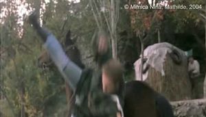 Photogramme 72 : Mathilde, Plan 1646. Retour au début du film. C’est le développement des inserts concernant Paradic à cheval, comme par exemple, au plan 79. Or, nous allons apprendre, qu’à ce moment précis, Paradic voulait sauver son fils qui jouait avec le bateau (plan 122). Mais il sera abattu par les résistants Croates, et tombera de son cheval. Mathilde prendra la relève en sauvant Misho.