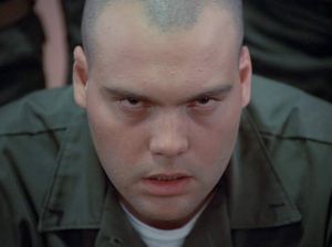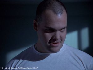 C’est la dernière nuit dans la base militaire, avant de partir pour la guerre au Vietnam. Guignol est de garde, il entend des bruits dans les toilettes. Il y entre, il trouve Baleine qui charge son arme (Léonard Lawrence, dit « Gomer Pyle » (« Grosse Baleine », interprété par Vincent D’Onofrio). Il a au visage un regard presque satanique, il charge très lentement son chargeur. Il sourit à Guignol (son seul véritable ami dans le groupe), et lui dit d’un air diabolique. (Cf. Photogramme – Yeux vers le ciel 2.)