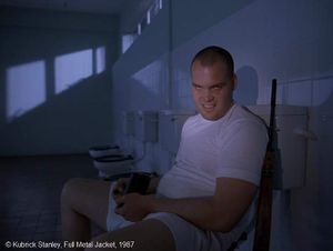 Il se lève brusquement avec une grande détermination et il crie, dans la nuit silencieuse : « Epaule gauche ! Epaule droite… Apprivisionné-Chargé. Arme… au pied. Ça, c’est mon fusil ! Il y en a beaucoup comme ça, mais lui, c’est le mien ! (Les soldats commencent à se réveiller, ils se lèvent… Le sergent Hartman (inerprété par Lee Ermey) sort de sa chambre en criant : « Rerournez au pieu ! » Il entre dans les toilettes :