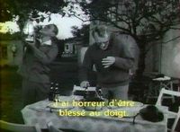 Plan 26 : 9'03" Martin et son beau-père préparent le dîner. Ce dernier accroche une lampe à pétrole, Martin ouvre une bouteille de vin. Il se blesse à l'index, le doigt accusateur. (Cf. Photogramme – Doigt 1)