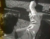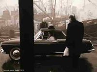 Photogramme - Chapeau 2 : Stalker, Plan 14. L'Écrivain perd son chapeau, posé sur le toit de la voiture. Notez le poteau dans l'image qui constitue "un obstacle".