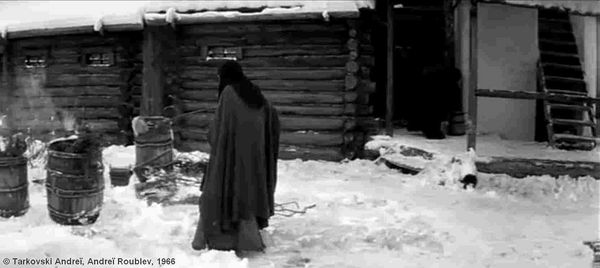 Plus précisément alors, nous pouvons souligner que la place des crachats est la terre, un sol enneigée, froid ; les crachats et la pierre atterrissent sur le sol. Et pour que la graine de la parole et la bienveillance humaine donnent des fruits, il faudra attendre la pluie abondante du VIIIème épisode, la fougue débordante d'un jeune homme dans la boue de la terre, dans le son et le bruit de la terre, dans le brassage argileux de sa substance. Tarkovski prépare remarquablement la délivrance de Roublev et donc la délivrance de l'art dans le spirituel. C'est aussi une thématique tarkovskienne, la quête de la foi. Comme le dit le Stalker, "L'important c'est de ne pas perdre sa foi." Roublev n'avait pas perdu sa foi. Sa foi a été violemment perturbée, bouleversée. Il choisit donc de livrer son silence à Dieu. Il n'a pas perdu sa foi, parce qu'il est resté au monastère, et il s'est occupé du fardeau de son silence : la sourde-muette. Contrairement à Kyril, pour beaucoup moins que ça, au IIIème épisode, il tue son chien, il jette son baluchon, c'est-à-dire son fardeau, et il s'en va pour atterrir dans un lac gelé, "l'œil de la terre", [12] poursuivi par les "cousins" du chien, les loups. Kyril, bien plus tard, avouera à Roublev son incrédulité et sa perte de foi. Kyril ne livre pas son silence à Dieu, mais il a la voix enrouée, comme si elle venait des profondeurs de la terre, une voix déterrée. De plus, si nous remontons à l'origine du silence de Roublev, au plan 240, il tue un russe parce que ce dernier a emporté la sourde-muette sur son épaule pour la violer. Au VIIème épisode, 4 ans plus tard, le chef tatar emporte la sourde-muette sur le dos d'un cheval, et Roublev continue sa tâche, comme si de n'était rien. On peut dire que Kyril revient des loups, et Roublev revient des tatars.