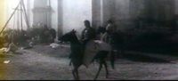 Dans l’épisode suivant, au Vème épisode, durant le sac de Vladimir, devant l’église, à un moment donné, l'agitation générale baisse et toutes les attentions se tournent vers le bélier en action. Et c'est à ce moment précis, que le chef tatar couvre son cheval d'une cape claire. Il se prépare pour son entrée triomphale dans l'église. (Plan 228d) (Cf. Photogramme – Cape 3.)