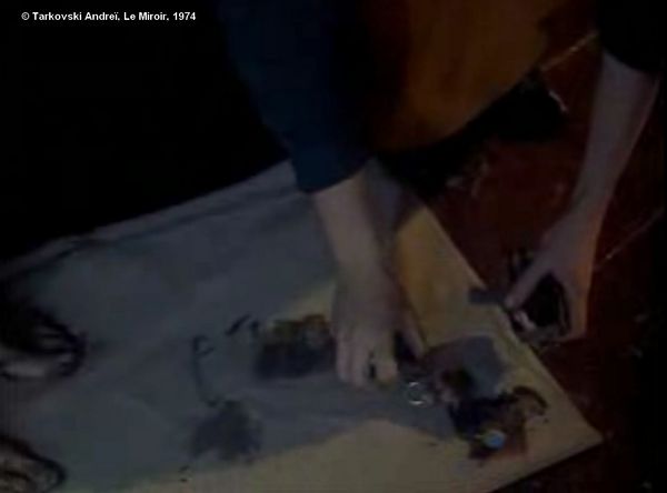 Du reste, il y a la position centrale d'Aliocha quand il s'assied. A sa gauche, le miroir ovale, qui reflète son image ; à sa droite, le lait qui coule goutte à goutte, reflète un aspect de sa mère. Le lait tombe d'une certaine hauteur, il atterrit d'abord sur une table sur laquelle sont disposées des pommes de terre et leurs épluchures, le lait qui devient une flaque et déborde sur le plancher. Ce plan rejoint sans difficultés le plan 134. Lors du second rêve d'Aliocha enfant : la mère, les pommes de terre et le chien. Il rejoint également le plan 17 : "le chat noir et le lait renversé".