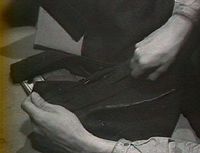 Fontaine munie d'un rasoir, découpe un costume en bandes parallèles afin d'en faire une corde (en voix-off) : "J'en fis des tresses, comme j'ai vu ma mère en faire avec les cheveux de ma sœur…" (Plan 62.) (Cf. Photogramme – Corde 1)