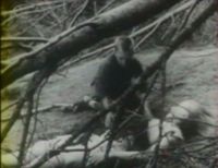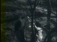 Plan 73-26 : 40'10" : Tout à coup, au pied d'un grand arbre, et à travers une petite flaque d'eau, une couleuvre traverse rapidement la flaque d'eau de droite à gauche, pour disparaître dans l'herbe. (Cf. Photogramme - Arbre 5)