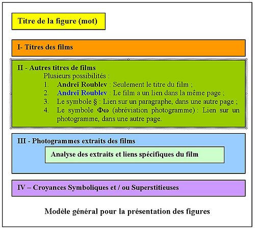 En forme de tableau, cette rubrique concerne les titres de la figure donnée. La figure du cheval par exemple, propose les titres des films suivants : Le Cheval qui pleure, de Marc Donskoï ; La Chevauchée fantastique, de John Ford ; Les Chevaux de Feu, de Serge Paradjanov. Dans chaque film le cheval acquiert une certaine importance, dans Les Chevaux de Feu par exemple, les chevaux n'ont pas une implication directe dans la diégèse du film. Ils ont plutôt une fonctionnalité poétique. Ce qui nous intéresse dans cet aspect de répertoire de titre d'une figure, c'est justement les métamorphoses que subit une figure chez un auteur. Nous avons vu l'importance des titres chez Andreï Tarkovski.