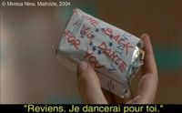Photogramme 20 : Séquence 20 [D - 1] - Plan 355 : 0h 16' 55": Barbara gît au milieu des affaires de son mari, elle fume une cigarette. A un moment, elle tourne le paquet et découvre un curieux message : « COME BACK I WILL DANCE FOR YOU. » (« Reviens je danserai pour toi. ») Tout à coup, le visage de Barbara change et devient perplexe, elle s’interroge sur la signification de ce message.