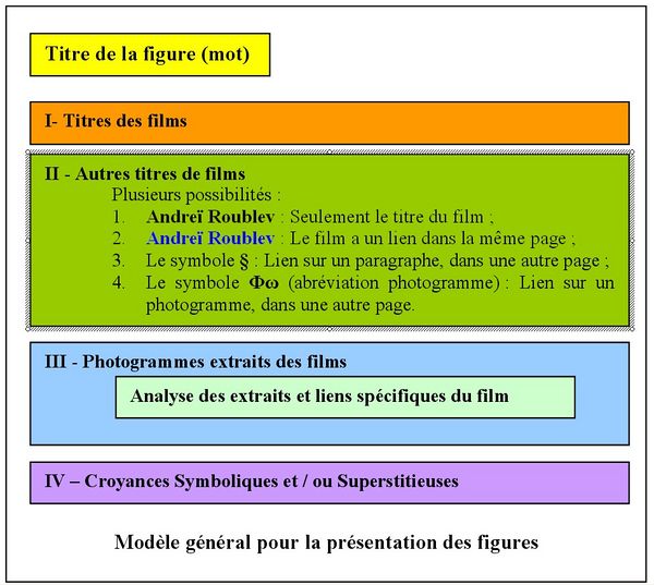 1. Les titres de films. En forme de tableau, cette rubrique concerne les titres de la figure donnée. La figure du cheval par exemple, propose les titres des films suivants : Le Cheval qui pleure, de Marc Donskoï ; La Chevauchée fantastique, de John Ford ; Les Chevaux de Feu, de Serge Paradjanov. Dans chaque film le cheval acquiert une certaine importance, dans Les Chevaux de Feu par exemple, les chevaux n'ont pas une implication directe dans la diégèse du film. Ils ont plutôt une fonctionnalité poétique. Ce qui nous intéresse dans cet aspect de répertoire de titre d'une figure, c'est justement les métamorphoses que subit une figure chez un auteur. Nous avons vu l'importance des titres chez Tarkovski.