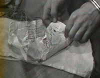 Dans ce sac improvisé, Fontaine trouve une épingle, une lame à rasoir et des morceaux de sucre.