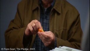 Dans son bureau Stan mangeait une orange, et Jerry fumait une cigarette. (Cf. Photogramme – Épluchure 3.) L’épluchure de l’orange va devenir un substitut de cendrier. Jerry écrasera sa cigarette dans l’épluchure, et Stan va jeter l’ensemble dans la poubelle. (Cf. Photogramme – Épluchure 4.)
