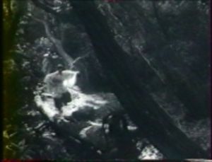 Plan 73-26 : 40'10" : Tout à coup, au pied d'un grand arbre, et à travers une petite flaque d'eau, une couleuvre traverse rapidement la flaque d'eau de droite à gauche, pour disparaître dans l'herbe. (Cf. Photogramme - Arbre 5)