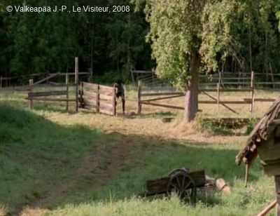 Plan 35 : La jeep arrive dans un hangar et elle s’arrête devant une barrière en bois. Le Stalker demande à l’Écrivain : « Allez voir si la draisine est sur la voie. » L’Écrivain répond : « Quelle draisine ? » Le Stalker insiste : « Allez, Allez ! » L’Écrivain descend de la jeep, et se baisse sous la lourde barrière, pour passer de l’autre côté. (Cf. Photogramme - Barrière 6.)Après quelques pas, une courte rafale broie le silence. Il se couche à terre et reste immobile. Nous sentons qu’il perd ses moyens. Le Professeur réagit et dit : « Laissez, je vais faire. » L’Écrivain retourne vers la jeep.
