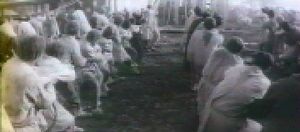 Plan 367-56 : 2h 52' 49" : Plan général du chantier de la cloche. Des robustes paysans alignés en rangs, tirent grâce à des cordes, le poids imposant de la cloche. Tout le village commence à se réunir pour l'ultime acte d'élévation. (Cf. Photogramme – Cloche 3)