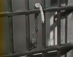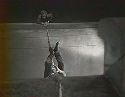 Il parvient vers le mur extérieur. Il fait un signe à Jost de venir. Le condamné à mort s'est échappé grâce à ce crochet. Comment aurait-il fait autrement ? Mais on n'a pas fini le plan 138. Car l'image ne montre pas la partie inférieure. En effet, il manque un petit détail. Le crochet est accroché à un minuscule fil téléphonique : "La liberté qui tenait à un fil."