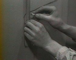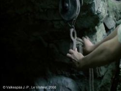 Fontaine suit l'avis éclairé de son voisin. Il commence par enlever le cadre de sa lanterne. Avec une cuillère, il dévisse les vis. Il casse le verre qu'il recouvre au préalable avec un drap et jette le verre cassé dans un grand seau (plan 80). Il vide le tout dans la fosse (plan 81). Il dessine la terrasse du bâtiment et l'épaisseur des murs d'enceinte. (Cf. Photogramme – Crochet 1)