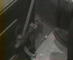 Il plie deux barres métalliques à 90°, qu'il relie avec un fil de fer provenant du grillage du lit. (Cf. Photogramme – Crochet 2 et 3)