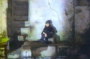 Plan 84 : 1h 18' 30" : Intérieur de l'église inondée. D'un côté d'un mur en ruine apparaît une petite fille qui se cache aussitôt que le Poète entre dans l'église. (84a) Sous un autre angle, et d'un autre côté de l'église, la petite fille apparaît de nouveau. (84b)