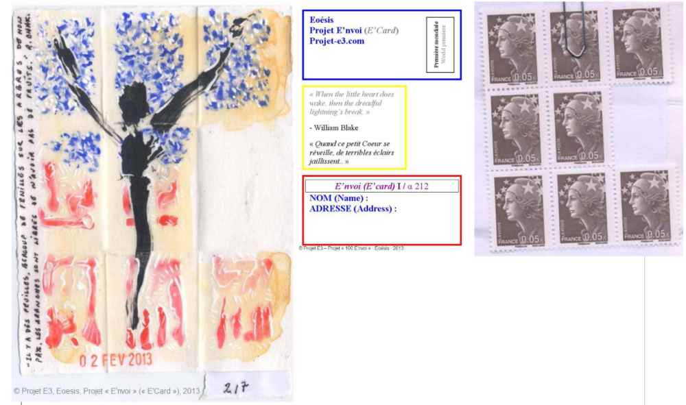 α (alpha) 217 , un exemple du Projet « E'nvoi ». Un projet à programme. Au recto : une carte en forme d'un petit film, les photogrammes sont remplacés par des petites cases (8). La surface n'est pas lisse et léchée, l'expression est libre, gestuelle et spontanée, les soins... sont réservés pour les « hôpitaux » ! Au verso, à droite, l'adresse du destinataire, l'extrait bilingue d'un vers poétique, ici, un vers de René Char : « Il y a des feuilles, beaucoup de feuilles sur les arbres de mon pays./ Les branches sont libres de n’avoir pas de fruits. » à gauche, les timbres qui reprennent la forme d'un « E » majuscule.