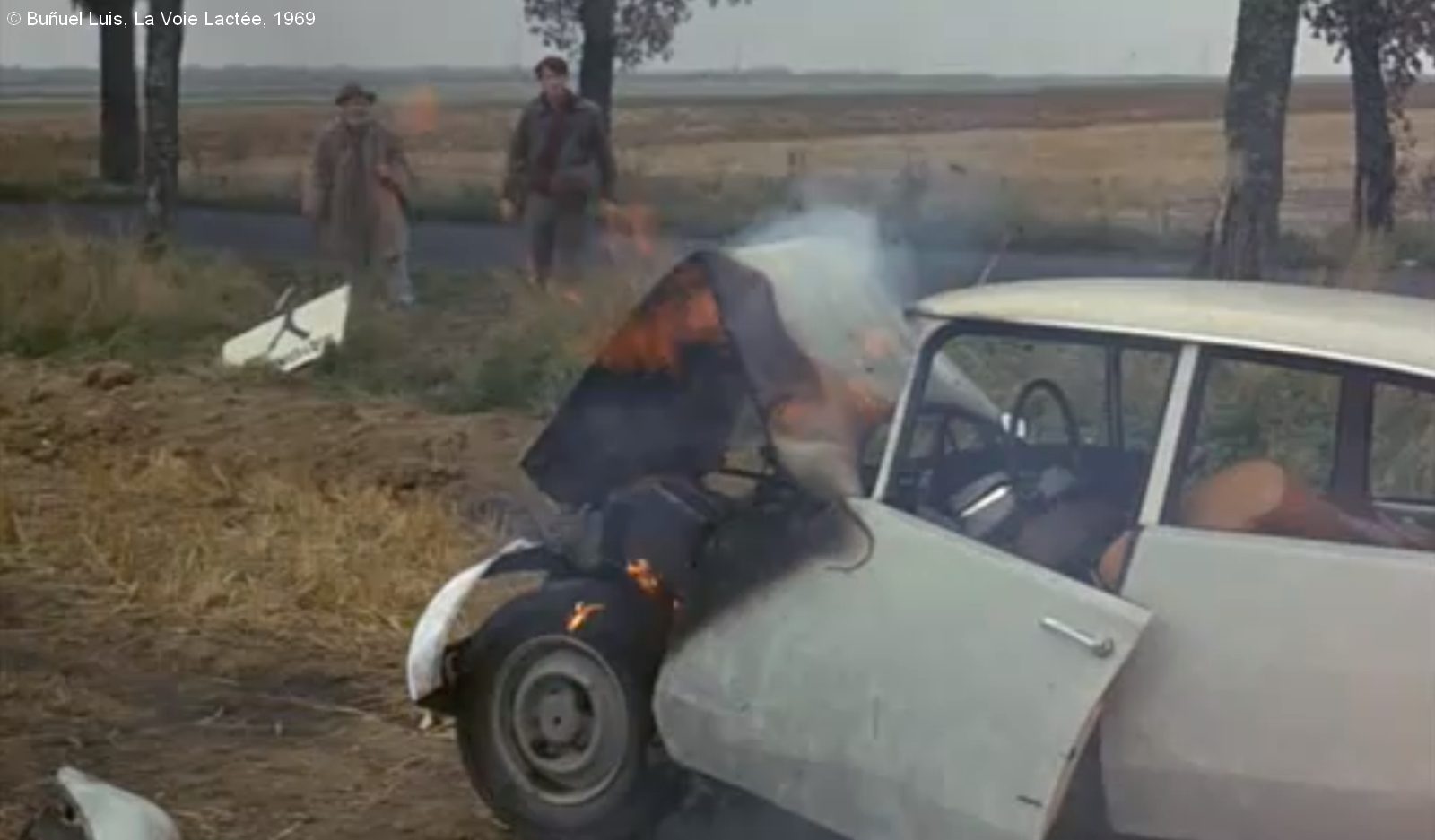 La Voie Lactée. L'accident a eu lieu de la manière suivante : Pierre et Jean sont sur le bord de la route. Ils voient venir une voiture blanche, conduite par un homme seul. Jean d'un geste machinal, demande au conducteur de s'arrêter. Le chauffeur ne les regarde même pas et continue. La voiture passe. Jean s'écrie, furieux : "je voudrais bien que tu te casses la gueule ! Hé salaud !" Brusquement, à l'instant précis ou Jean termine sa phrase, on entend un terrible fracas métallique, le bruit d'un accident. Pierre et Jean se lèvent et s'avancent vers la voiture qui s'est écrasée en contre-bas de la route.