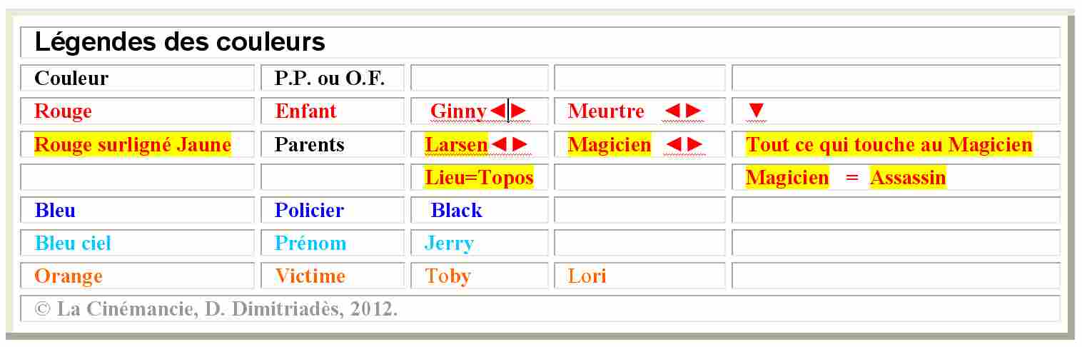 The Pledge de Sean Penn. Légendes des couleurs. La légende est simple : Le rouge représente, le meurtre ; le rouge surligné en jaune, concerne le « Magicien » ; le bleu représente Jerry Black.