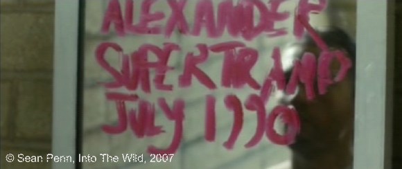 | actuel | 7 août 2011 à 22:44 | 580 × 244 (25 kio) | Dimitri Dimitriadès (discussion | contributions) | Photogramme 23 : ''Into The Wild'', '''Plan 371'''. Muni du rouge à lèvre, Christopher écrit sur toute la largeur du miroir : « ''Alexander Supertrmap, July 1990.'' » |