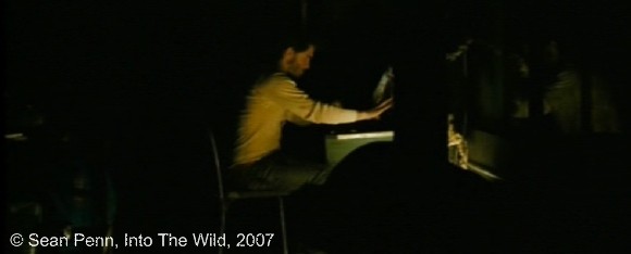 Photogramme 33 : Into The Wild, plan 556. Christopher lève les bras et commence une autosuggestion : « Tu es fort. Tu peux aller où tu voudras. L'argent, le pouvoir sont une illusion. Tout est là. On peut le faire, moi et toi. »