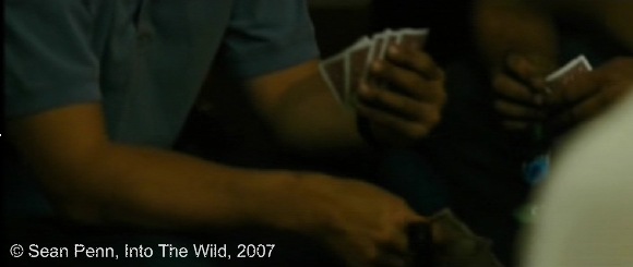 Photogramme 35 : Into The Wild, plan 592. Le soir, toute l'équipe s'amuse et boit de la bière. Wayne demande : « Aller, on se le fait ce poker ? » Christopher enchaîne « Deux dollars, quatre dollars, six dollars, tout le pognon sur le tapis, et tout le monde va se faire plumer comme il faut.