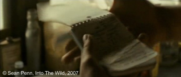 | 10 août 2011 à 23:03 | 580 × 247 (20 kio) | Dimitri Dimitriadès (discussion | contributions) | Photogramme 55 : ''Into The Wild'', '''plan 1180'''. Il pose le fusil et un sac en plastique transparent, Il ouvre un tiroir, il prend le petit carnet noir, il se demande à voix haute en feuilletant le carnet : « ''C'est où ?'' ». |