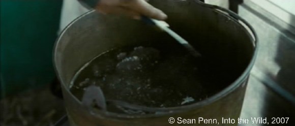 Photogramme 6 : Into The Wild, Plan 125. Christopher s’installe dans le Bus, il fait fondre de la glace sur la cheminée. Nous verrons plus loin dans le film une relation avec cette image.