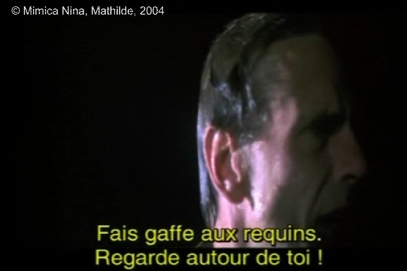 | actuel | 24 juillet 2011 à 23:42 | 580 × 386 (27 kio) | Dimitri Dimitriadès (discussion | contributions) | Photogramme 16 : ''Mathilde'', Plan 280. Après son plongeon, De Petris cherche Mathilde : « ''Où tu es ?<br/> - Et toi ?<br/> - Continue à parler, que je te localise.<br/> - Fait gaffe aux requins. Regarde autour de toi ! |