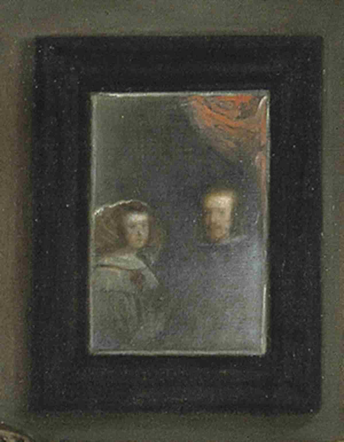 Image - Peinture 5 : Les Ménines, (Détail), Diego Vélasquez. Sur un miroir, deux personnages s'y reflètent ; ce sont le roi Philippe IV et la reine Marianne.