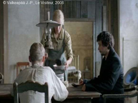Le Visiteur, (Muukalainen), photogramme 70, plan 242, à table, le Visiteur va s'asseoir à la place du Père (cela nous le supposons).