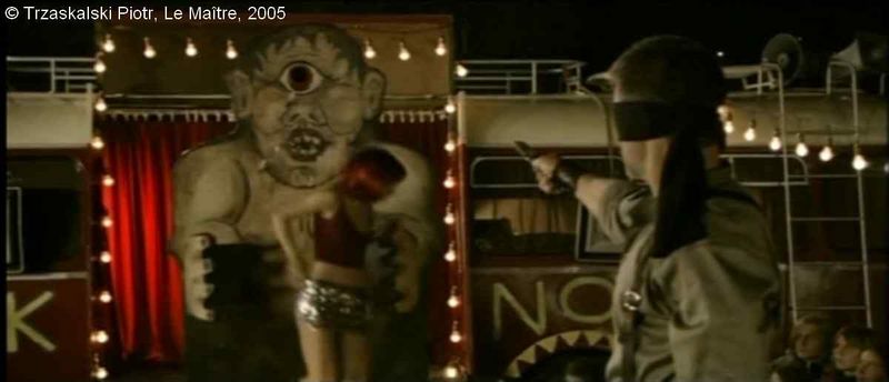 Photogramme - Yeux 2 : Le Maître, Plan 24. 10' 38". Alexandre au cours son spectacle. Les yeux bandés, il doit « délivrer » (pour la seconde fois) Angela des bras de Polyphème.