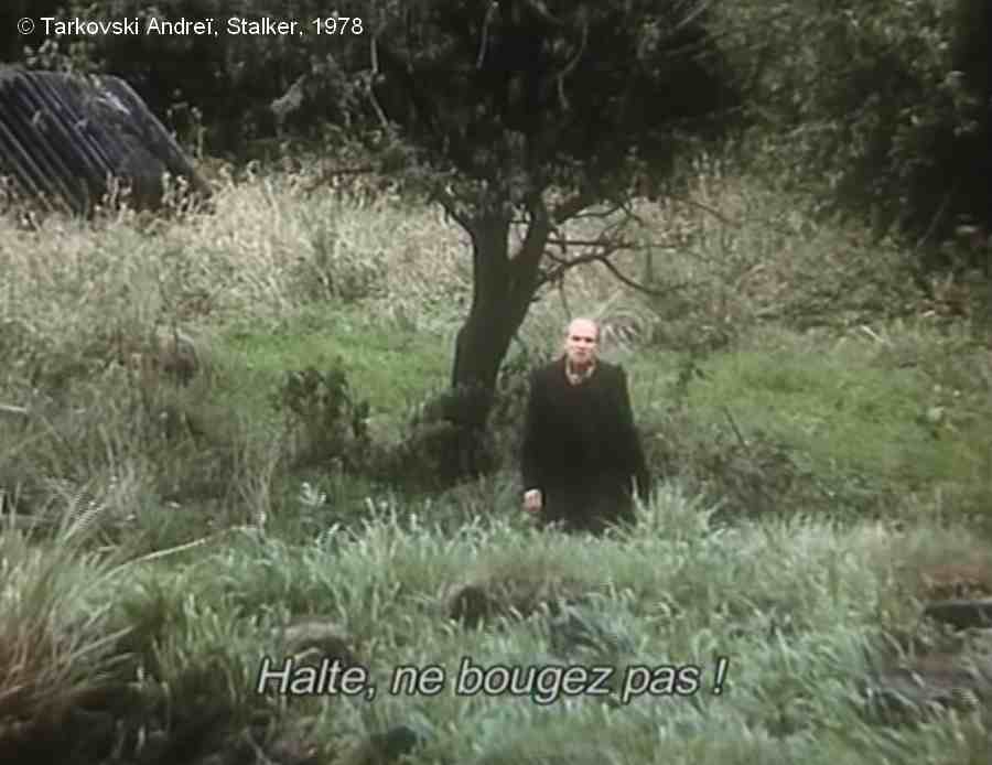 Stalker, Photogramme - 40 : Plan 61a. Une voix caverneuse venant d’ailleurs se manifeste gravement à l’intention de l’Écrivain : « Halte, ne bougez pas. »