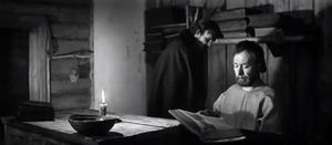 Par ailleurs, nous avons souligné dans "Le rêve d'Aliocha" l'ambivalence du "père du héros" et du "père de la patrie" ; dans "le songe d'Ignat", à supposer que c'est un songe, la Dame en noir devient "la mère de la patrie", ce qui explique l'intense éclairage, presque surnaturel autour de la pièce, ainsi que l'éclairage de face sur le visage d'Ignat, au moment où il lit la lettre de Pouchkine : une lumière intérieure qui s'achemine vers l'extérieur. De plus, il y a de nouveau "un fait formel" révélateur, au moment de la lecture d'Ignat. La prise de vue et la disposition de l'image proposent "une lecture littérale" : Le visage de la dame en noir est situé dans le prolongement de l'ouverture en V du livre. (Cf. Photogramme – Livre 4.)