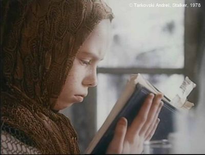 Nous avons fait allusion à ce genre de plan dans Nostalghia. Il s'agit du transfert psychologique du Fou vers le Poète : La "résonance", grâce à un prolongement de "ligne de force" entre les deux hommes. Ici, la "résonance" s'établit entre la dame en noir et Ignat, en passant par le livre. (Cf. Plan 37.) Il nous semble que la question du "transfert"mérite un approfondissement, nous avons des bonnes raisons de croire que cet aspect cache des éléments pertinents.