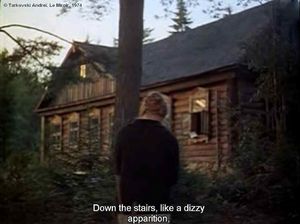 En somme, nous apercevons que le cinéma d'Andreï Tarkovski est un cinéma de combinaisons sémantiques, parallèles. C'est-à-dire que des séquences disparates détachées de leurs contextes diégétiques sont à tout moment susceptibles d'intervenir dans un sens déterminé. Et, quand la traductrice au paroxysme de son délire, jette, fâchée, sa brosse à cheveux dans le coin même où le Poète auparavant a jeté le livre (qu'il a d'ailleurs pris de la Traductrice). Les objets en question sont les marques de leurs attributs respectifs, qui sont violemment rejetés dans un coin, comme si le poète et la Traductrice voulaient punir leur emblème, la brosse pour la femme, emblème de beauté, le livre de poésies pour le Poète, emblème complexe de création.