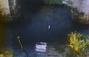Plan 18 : 12' 18" : Il voit tomber à ses pieds, dans une flaque d'eau, une plume blanche. (Cf. Photogramme – Plume 5.)