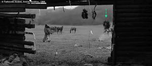 Plan 125 - 19 : 1h 01' 10" : C'est le jour, il entre dans la cour fermée d'une ferme, il passe derrière une vieille femme qui, curieusement, se balance sur une balançoire au son strident. Elle est face à nous. Il s'arrête quelques instants. C'est en fait, un premier indice du "vieillissement"de Roublev. [10] Il traverse toute la cour, et passe sous un porche. Il fait à peine quelques pas, une couronne en paille, parmi d'autres couronnes fixées sur le porche, tombe en silence sur le sol. (Cf. Photogramme – Porte 5.)