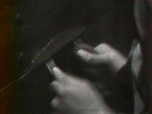 Il avance vers une armoire (27d), il ouvre les portes, elle est vide, il la referme (27 e). Il se dirige vers un meuble avec un miroir, il prend un livre (27f). Le livre toujours à la main, il l'ouvre. Un objet tombe, sans que nous sachions ce que c'est. D'après le son de la chute, c'est plutôt un bouton (d'un manteau !) qu'une pièce de monnaie. Le livre, c'est une Bible. [15] Il remarque, à la première page de la bible, une mèche de cheveux enroulée autour d'un peigne.