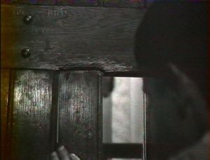 Plan 60 : 0h 57' 58" : Le Poète veut prendre congé. "Le Fou" l'accompagne. Ils traversent le grenier. "Le Fou" passe inutilement une porte flanquée en plein milieu de l'énorme pièce. Il prend le soin d'ouvrir la porte, de se retourner, et de la fermer calmement (60b). (Cf. Photogramme – Porte 15.)