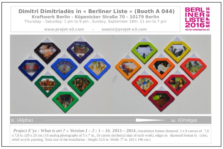 | 2 septembre 2016 à 16:01 | 3-Berlin Liste-Carte-Invitatin-a-2016.jpg (fichier) | 98 kio | Dimitri Dimitriadès (discussion | contributions) | [http://www.projet-e3.com/projet-eye-what-is-art-version-i-2/ ''Projet « E’ye : What is Art ? »''] Version I – 2 : 1 – 16. 2013 – 2014, de Dimitri Dimitriadès. <br/> Installation format diamant. 2 x 8 toiles sur châssis de 20 x 20 cm. 1... | 1 | |