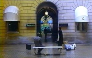 Plan 98 : 1h 31' 31" : Le Poète est devant le parvis d'un grand hôtel romain. Il vérifie ses sacs de voyage. Il s’assied sur le banc. (Cf. Photogramme – Banc.)